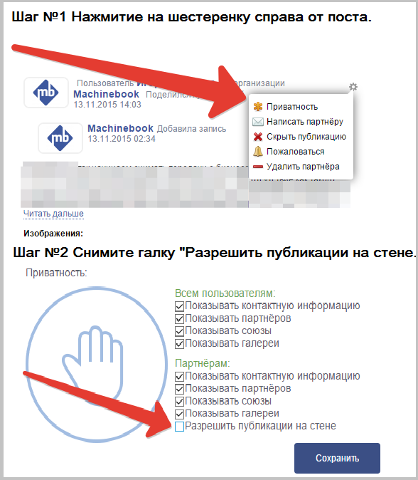 Партнеры! Важное объявление! Если в профиле Вашей компании, кто то из Ваших партнеров поделился своим постом, а вы не хотите видеть эту запись, вы можете легко это убрать или навсегда поставить запрет . Нажмите на шестеренку рядом с постом и выполните предложенные действия. Пример. Выбрав "Прива… Читать дальшетность" вы перейдете в данный раздел, где нужно снять галку напротив "Разрешить публикации на стене" и нажать "Сохранить". Всё, больше никто не сможет сделать запись в ленте вашего профиля. Если Вы считаете что Вас кто то оскорбляет, выберите "Пожаловаться", далее в сообщении напишите суть проблемы, номер или название компании или опубликованные материалы и нажмите "Отправить". Спасибо за внимание! Команда Machinebook.